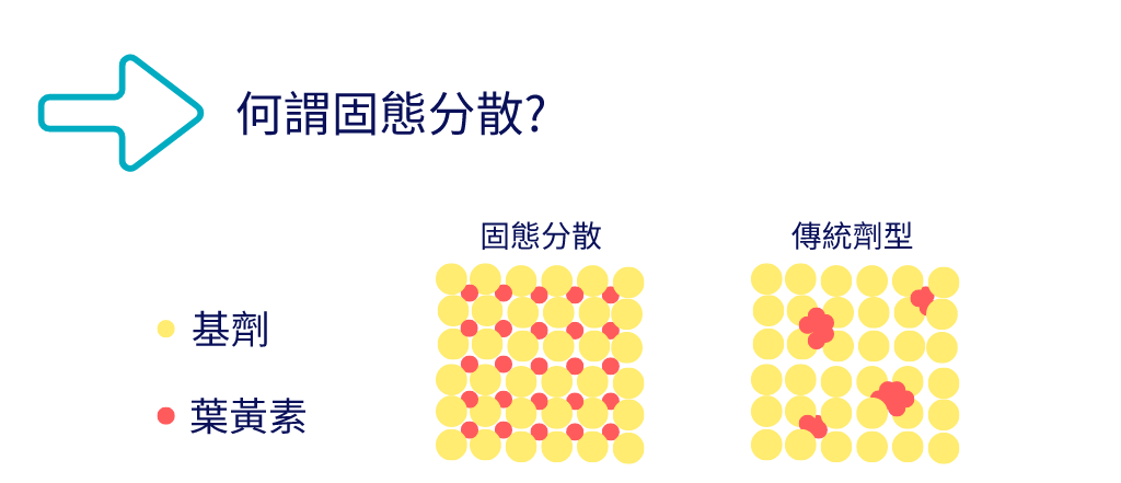 那固態分散到底是甚麼? 固態分散是一種將目標藥物以分子、膠體、微晶或無定像的方式均勻分散在基質中,基質可以是水溶性的、腸溶性的,看需求而做調整。通常這應用在難溶難吸收的目標藥物,藉由均勻分散的方式增加生物吸收度。(也就是難吸收的變成好吸收的!)既然難溶藥物都可以增加吸收度了,那我們平常吃的保健品呢?答案是顯而易見的,像是葉黃素在一般傳統的劑型中,就是比固態分散劑型的吸收度差了3倍!但是目前卻沒有人將它商品化,實質呈現給一般民眾,享受最好的效果。 沒錯!我們賣的真的是世界首創!除了葉黃素,我們也致力於保健品以固態分散劑型呈現給大家,讓大家享受到如同先進藥物的效果!