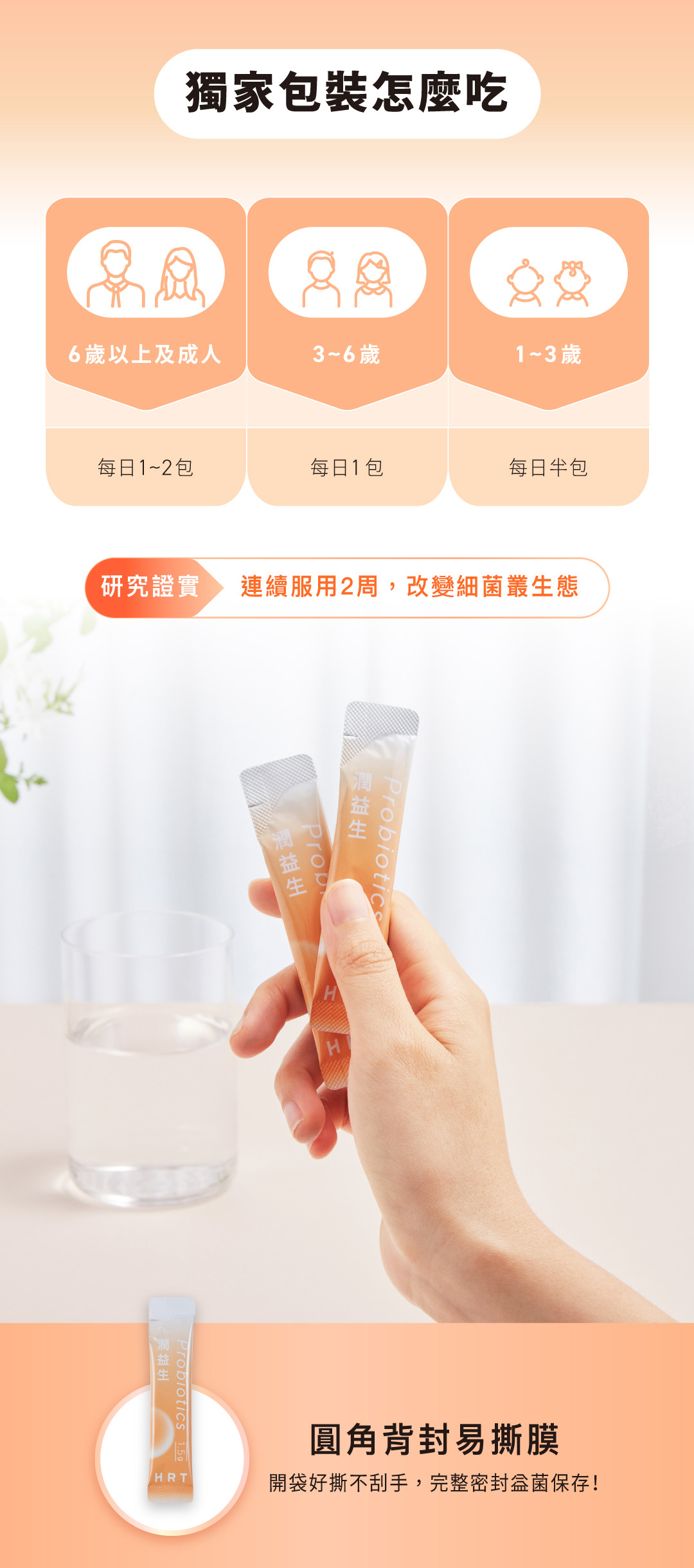 | 食用方式 | 1~3歲: 每日0.5包, 3~6歲: 每日1包, 6歲以上與成人: 每日1~2包 |