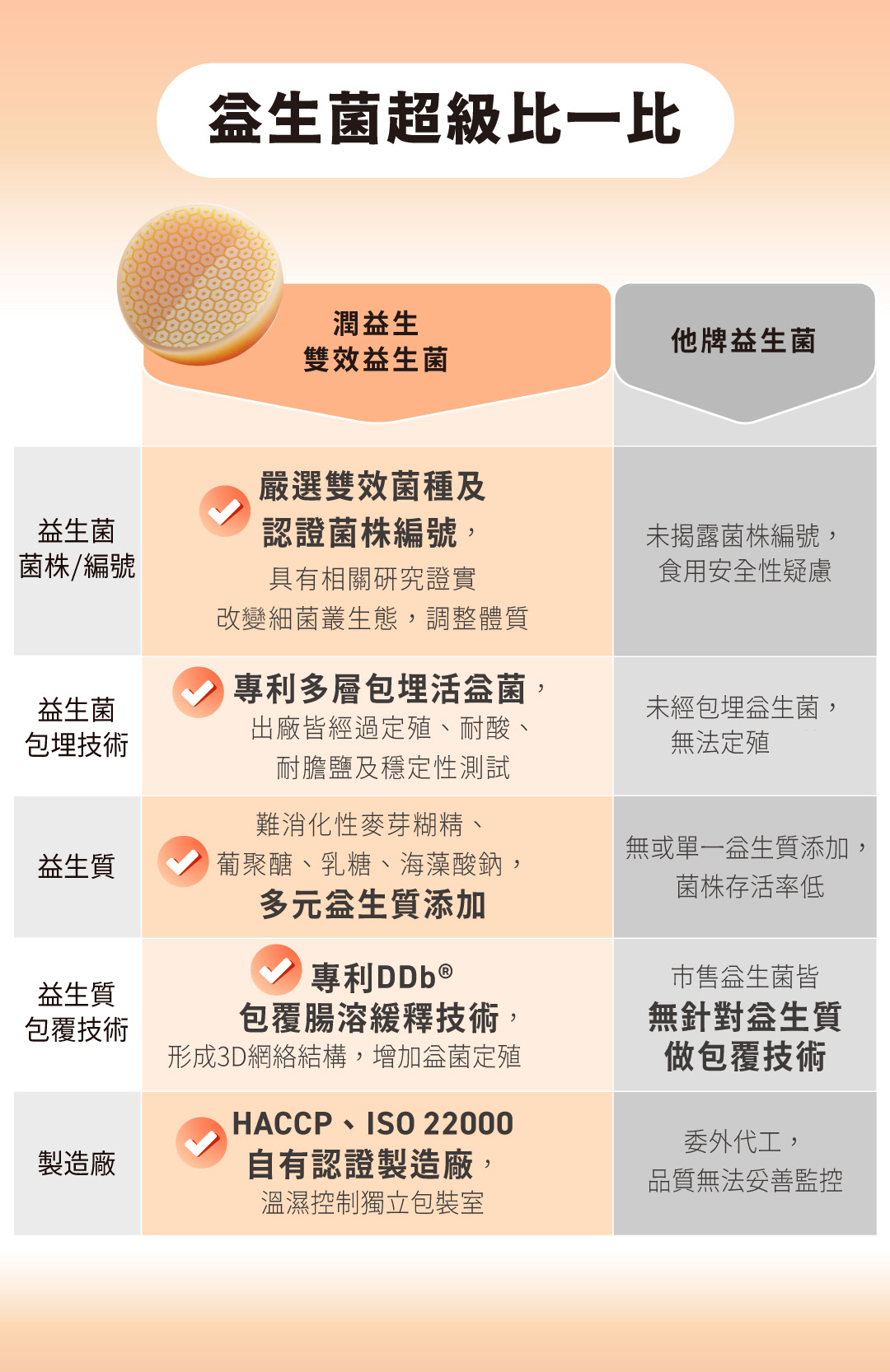 | 成分 | 難消化性麥芽糊精、優酪乳粉(蔗糖、脫脂奶粉、麥芽糊精、全脂奶粉、葡萄糖、檸檬酸、酵母萃取物、香料、脂肪酸甘油脂)、細粉葡萄糖、益生菌(約氏乳桿菌、嗜酸乳桿菌、乳雙歧桿菌、植物乳桿菌、發酵乳桿菌、鼠李糖乳桿菌、微結晶狀纖維素)、乳糖、DDb益生質顆粒(玉米澱粉、難消化性麥芽糊精、海藻酸鈉、水、氯化鈣、葡聚醣)、二氧化矽 |