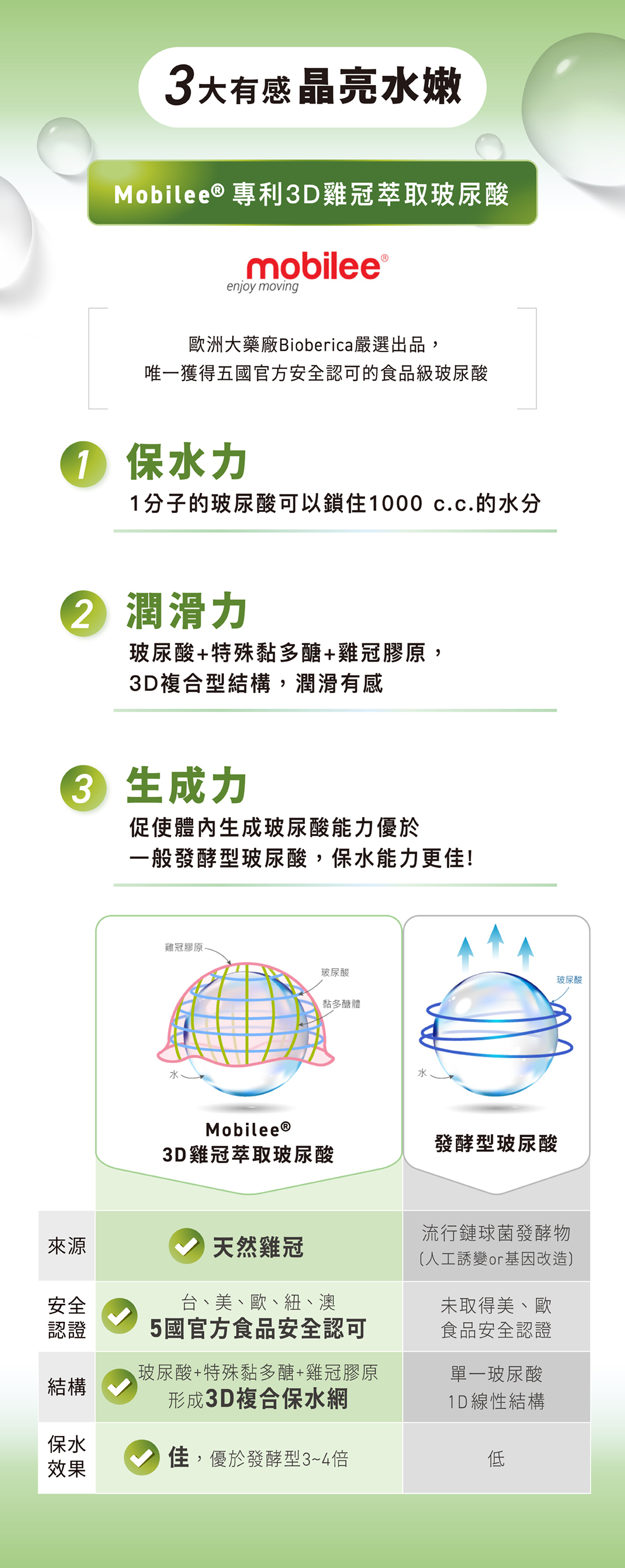 - 複方添加: 專利大廠mobilee®雞冠萃取玻尿酸,保水力比一般發酵型玻尿酸多了3~4倍,晶亮水潤