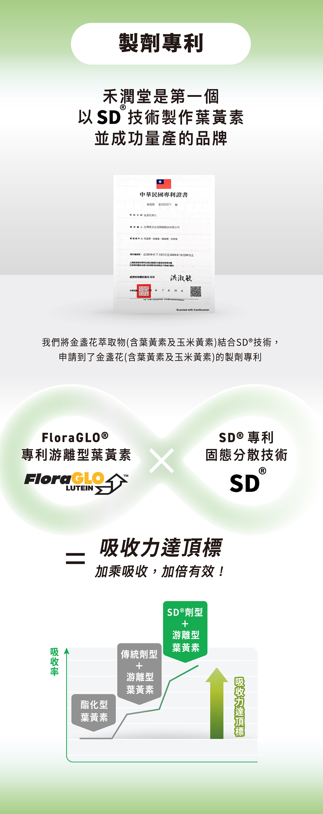 - 禾潤堂專利技術SD® X 游離型葉黃素 = 吸收度加倍!!