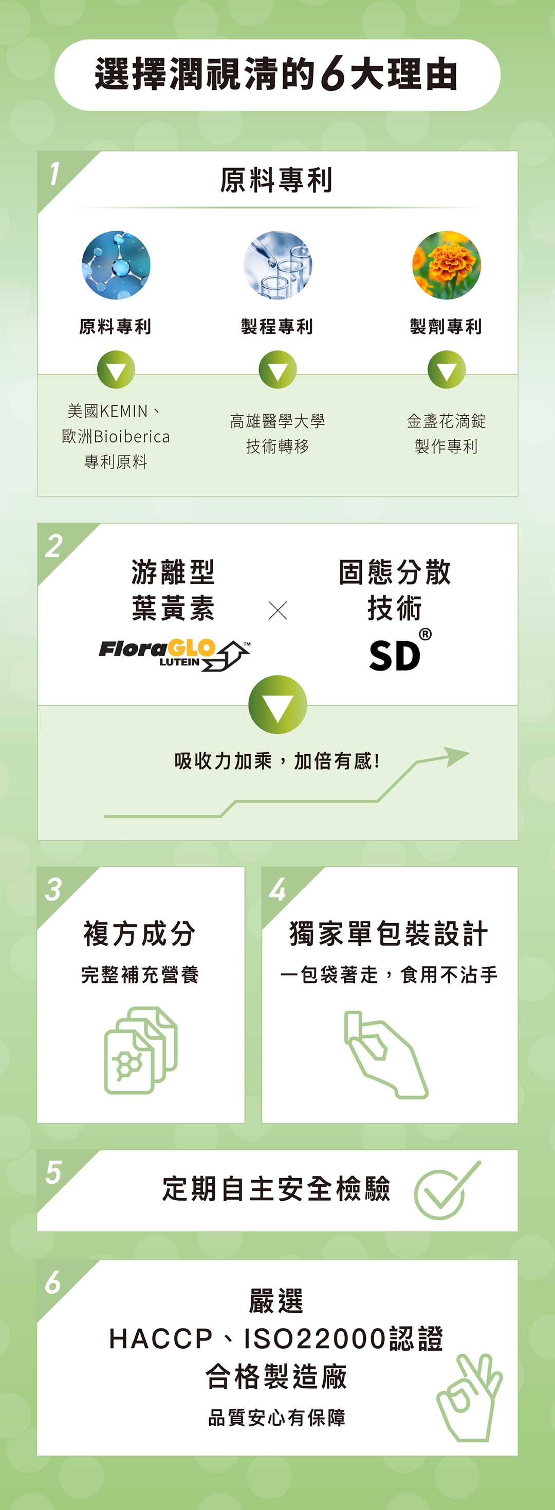 - 游離型 FloraGLO® 葉黃素:游離型 Zeaone®玉米黃素=10mg:2mg 黃金比例,足量添加