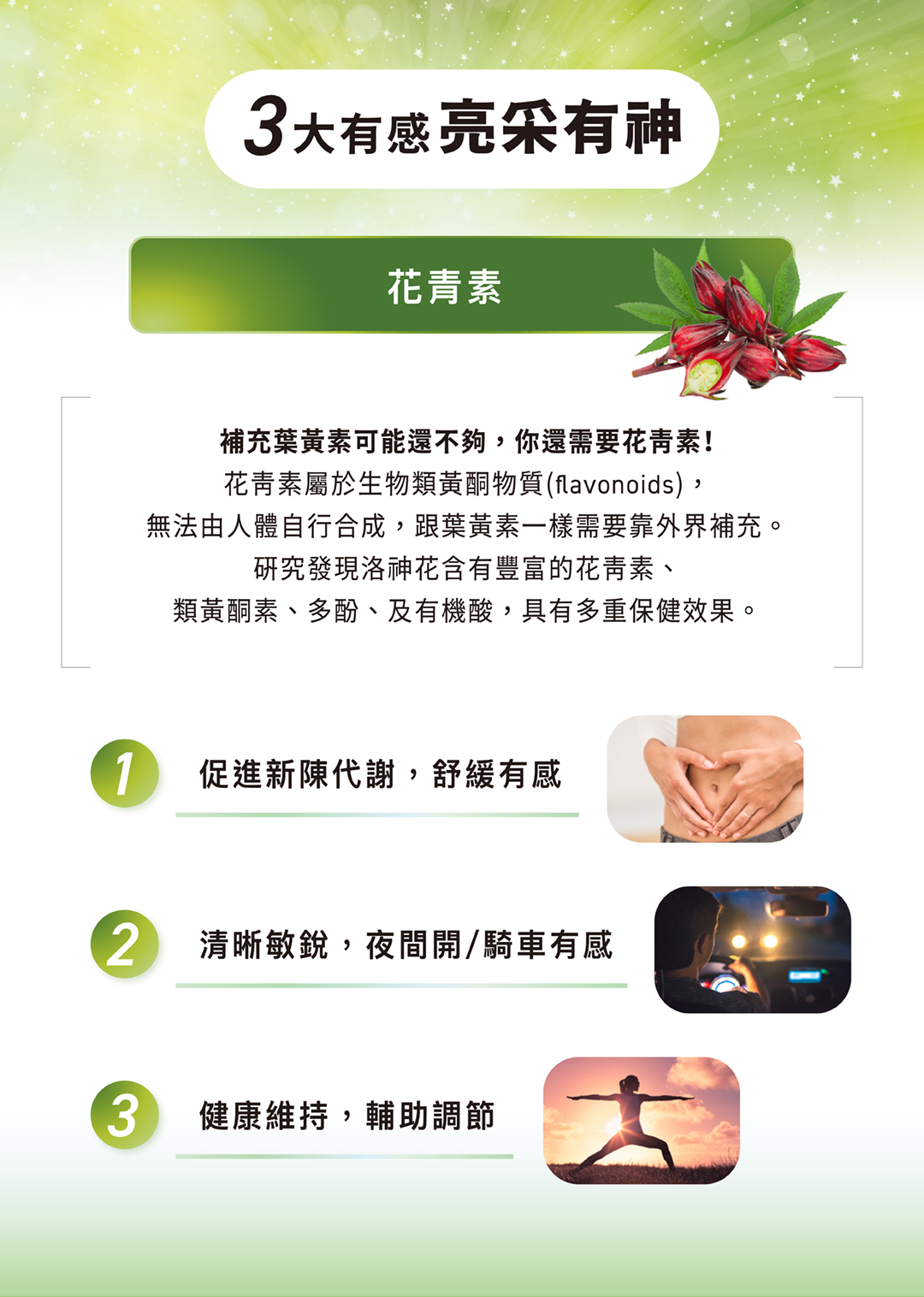 - 複方添加: 洛神花萃取物,富含花青素,清晰維持